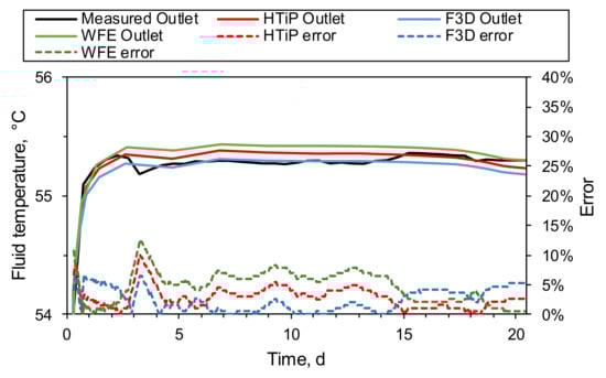 The result of the comparison between outlet fluid temperatures measured in the experiment and simulated approaches using the HTiP and other models is presented in Figure 8. It can be seen that all three models predicted the outlet temperature fairly well. The maximum error of fluid temperature drop for the HTiP model was calculated according to Equation (4) and was found to be equal to 8.5% at the beginning of the BHE operation. The maximum error between the measured and simulated outlet temperatures was most probably caused by a rapid and short change of fluid velocity in the experiment, which was averaged out in the simulation input and was not taken into account in the model. Such a change in fluid velocity would produce a more significant temperature drop in the BHE and would result in a higher error in the simulations. Later, the error dropped and oscillated between 0% and 5%. The average error for th whole operational period of 21 days was equal to 2.9%, 2.4%, and 4.7% for the HTiP, F3D, and WFE models, respectively, which was expected due to the different degrees of dimension reduction in BHE geometry in the models (depicted in Figure 1). The F3D had the lowest level of BHE geometry dimension reduction and was found to be the most accurate. On the other hand, the WFE had the highest level of dimension reduction and produced the least accurate results. The HTiP had only a slightly higher level of dimension reduction compared to F3D, and correspondingly, the result was only 0.5% less accurate, on average.