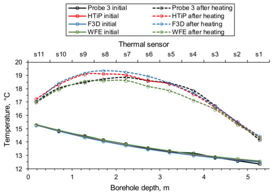 The results of the comparison between rock temperatures at the monitoring borehole, measured in the experiment and simulated approaches, using the HTiP and other models are presented in Figure 9. The temperature readings from 11 sensors (s1–s11) were used for the comparison with the numerical results because they were located closer to the heat source where the thermal signal was stronger. It can be seen that the simulated initial rock temperature at the start of the heating phase (solid lines in colour) achieved a good fit with the measurements (Probe 3 initial), with only small differences at the bottom of the monitoring borehole. The simulated rock temperature after the heating phase (dashed lines in colour) resembled the shape of the measured values, but did not achieve a perfect fit.