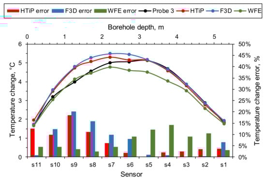The change in the rock temperature after 21 days of heating was calculated by subtracting the initial temperature from the final temperature. The comparison between the measured and simulated temperature change is shown in Figure 10. Additionally, the error was calculated with Equation (5). The errors for each of the three modelling approaches for each sensor are plotted in Figure 10. It can be seen that both the F3D and HTiP overestimated the temperature increase in the first 2.5 m of the monitoring borehole (sensor s7 to s11) with the highest prediction error occurring at sensor s9, with values of 18% and 20% for the HTiP and F3D models, respectively. The temperature change in the bottom half of the MOBH agreed quite well with the measurements, with the error oscillating between 0% and 4% for both models. A different behaviour was seen for the WFE model as it predicted a similar rock temperature change in the first 1.5 m and last 1 m of the MOBH and underestimated the rock temperature in the middle of the MOBH. The average error for the temperature change estimation was equal to 6.5%, 6.8% and 6.9% for the HTiP, F3D, and WFE models, respectively.