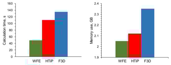 The fastest calculation time and the lowest memory use (see Figure 11a) were achieved by the WFE model by Al-Khoury et al. [,] due to the highest order of dimension reduction in the BHE’s geometry discretisation. However, the high computational efficiency led to a lowering in accuracy. The HTiP model was slower than the simplified WFE model. However, the HTiP model gave more accurate results, and the solution time could be further reduced by using an optimised meshing routine. Additionally, the HTiP model was almost as accurate as the fully discretised F3D model by Oberdorfer et al. [], with the calculation time reduced by almost 20% and the memory use by 10%.