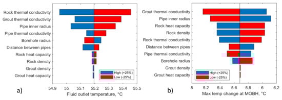 In the sensitivity analysis, the temperature of the fluid at the BHE outlet (Figure 12a) was mostly influenced by the thermal conductivity of the rock. A decrease of 25% in its value resulted in a higher fluid temperature at the outlet, which would lead to a lower fluid temperature drop and less heat being transferred into the surrounding rock mass. Other parameters influencing the fluid temperature drop were the thermal conductivity of the rock, grout, and pipe material—a decrease in their values resulted in a lower fluid temperature drop inside the heat exchanger (an increase in fluid temperature at the outlet). It was also observed that increasing the pipe radius and the distance between pipes in the heat exchanger resulted in a more substantial fluid temperature drop. Parameters such as heat capacity and density of the grout material were found to have low influences on the fluid temperature at the outlet.
