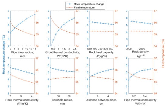 The results of the changes in the fluid outlet temperature and the maximum rock temperature change at MOBH after 21 days of heating are plotted in relation to variations in the selected input parameters (Figure 13). As expected, an increase in the thermal conductivity of the rock resulted in a decrease in both the temperature fluid at the outlet and the rock temperature change at MOBH. The lower fluid temperature at the BHE outlet resulted in more heat being transferred into the rock mass. However, due to the higher thermal conductivity of the rock, the thermal energy was conducted faster, which resulted in a lower temperature change in the rock at a 1 m distance.