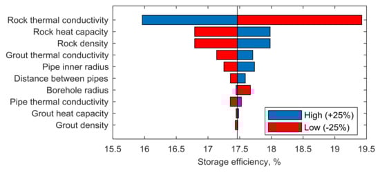Out of the abovementioned parameters, the first three explicitly formulate the thermal diffusivity of the rock, , and their magnitudes explicitly state that the low thermal diffusivity of rock is essential for increasing the storage efficiency. Thus, the thermal properties of rock relative to its use as a storage medium are the most influential factors and can only be influenced during the process of site selection for the project. All the other parameters from the list can be tweaked to maximise the storage performance of a BTES system in the detailed engineering design stage. The final values used for the BTES setup should follow a rigorous optimisation process based on technical and economic constraints.