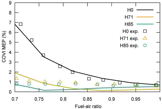 Simulated coefficient of variation (COV) of indicated mean of effective pressure (IMEP) after cycles (lines) and comparison with the experimental results of Ji et al. [] (symbols). Three concentrations of hydrogen by volume are considered: H0 (pure isooctane), H71 (71% H2 by total fuel volume), and H85 (85%). Details can be checked in [].