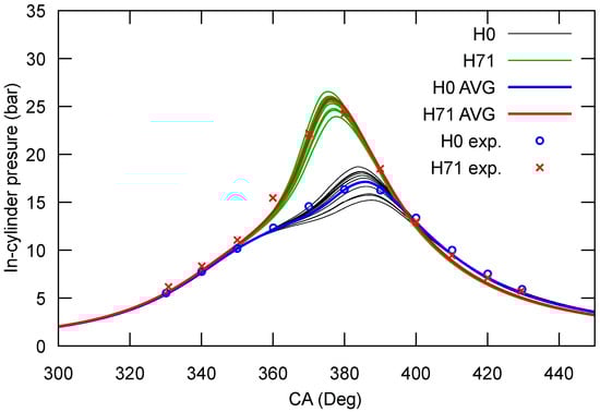 Plot of several cycles of in-cylinder pressure during combustion against crank angle (CA). Two hydrogen concentrations are shown, H0 and H71, for a fuel–air ratio . Thin lines represent individual simulated cycles; thick lines, average values (denoted as AVG); and symbols, experimental data [].