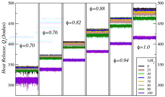 Simulated heat release time series for different fuel–air ratios, , and hydrogen concentrations, . Each case consists of 10,000 cycles.