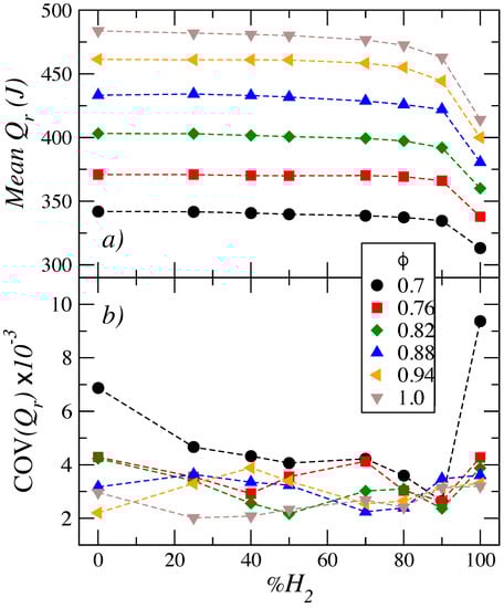 (a) Evolution of the mean value of the heat release, , vs. hydrogen concentration, , for different fuel–air ratios, ; (b) Evolution of coefficient of variation (COV) for the same cases.