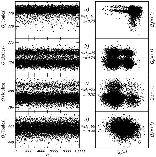 As commented in the Introduction, quasi-dimensional simulations allow us to obtain CCV time series of any variable in the engine for several thousand of cycles with a not-too-expensive computational cost. This is difficult to do in experiments or CFD simulations. Hence, it is an adequate technique for the diagnosis of CCV in spark ignition engines, particularly in which respect to the existence of determinism or long time correlations. Heat release time series were computed for several fuel–air ratios, from lean to stoichiometric mixtures, and for different hydrogen concentrations per fuel volume, from pure isooctane () to pure hydrogen (). In all cases, time series were obtained for cycles. These time series are depicted in Figure 3. The plot is divided in sections, each for a particular fuel–air ratio, , and for several values of hydrogen concentration, . It is observed that the mean value of increases when increases from to , whereas for a specific value of , it is apparent that the mean value of decreases with increasing hydrogen concentration. To understand this point, it is noteworthy that the energy density of hydrogen on a volume basis is much lower than that of gasoline. For this type of fuel the air displacement due to the gaseous state of hydrogen at inlet conditions results in a low volumetric efficiency and a loss of performance. Therefore, many hydrogen-powered engines suffer a lower heat release. This effect is clear in Figure 3 where for all fuel–air ratios the heat release decreases with increasing concentration of H2 and becomes minimal for . Thus, using a small amount of hydrogen as an additive to hydrocarbon-fueled engines could maintain the positive properties of isooctane, avoiding harmful power losses. Different levels of CCV dispersion are observed in Figure 3.