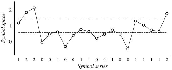 A number of symbol statistic techniques have been used for different but equivalent purposes: to extract information on high-dimensional dynamics hidden in low-dimensional time series observations [,,,]. Many of them, especially when applied to combustion engine variability, consist of the construction of an alphabet of n symbols obtained from the original time series by generating a discrete partition of n regions. A particular symbol value is assigned to each one [,,,]. As mentioned in [], there are main two procedures for selecting partitions: equiprobable partitions, where each partition has the same probability of appearance, and equispatial partitions, based on the division of intervals of the signal range. In the last case, rare events are easier to detect. In addition, to identify temporal patterns in the time series once it is symbolized, the joint probability of occurrence of L consecutive symbols, often called word, is analyzed. To generate these words a window of L symbols slides along the whole symbolized sequence in one-symbol steps. The total number of words of length L for an alphabet of n symbols is . It is also useful to evaluate the equivalent value (or code) for symbol-encoding. For example, if (binary partition) and , encoding results in words. As an example, a particular sequence or word 1101 has an equivalent decimal code of 13. The number of symbols to assign and the length of the word structure L depends on the structure of the data to be analyzed.