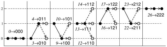 Representative soft transitions in symbol sequences for and . Decimal sequence codes are shown in each case. This notation will be used in subsequent analysis.