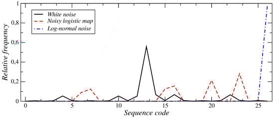 The pattern structure is analyzed by plotting symbol sequence histograms (SSHs). These are constructed with a horizontal axis corresponding to a specific symbol sequence code and a vertical axis with the relative frequency of the occurrence of each code. In Figure 9 it is observed that, for and , white noise exhibits a symmetric structure, centered in the code 13 (that corresponds to 111, which means that no variability is observed and the middle region is the most populated). The other words that are most frequent in white noise are 4(011), 10(101), 16(121), and 22(211). In all of them it is observed that the final state is 1, i.e., in spite of changes to another state, the sequence mainly prefers to return to the central region (or to remain in it) . On the other hand, the noisy logistic map exhibits a clearly unpopulated central state () and no symmetry is observed. Moreover, there are specific sequences which denote wild transitions between regions, as is the case of codes 6(020), 7(021), 15(120), and 20(202); or intermittency between middle and top region (codes 16(121) and 23(212)). These observations clearly describe the nature of the 2-period noisy logistic map used to generate the signals. Finally, log-normal noise is only significant at code 26(111), that is, there exists a preference to occupy the top state.