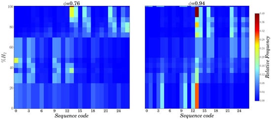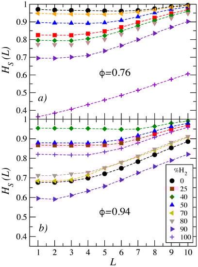 Here we review the symbolic analysis of the simulated heat release time series. First, Shannon entropy, , calculations are shown in order to select an appropriate word length, L. In Figure 10 the trends of vs. L for all the cases of and for two fuel–air ratio values ( and ) are depicted. The values of are sensitive to the variations of in both cases. For small values of L, decreases as the concentration of increases, except for the case and . These decrements in can be identified as an increment in the regularity and hence, as a signature of the existence of non-random structures. For large values of L, has a clear tendency to increase towards the value 1, indicating that the irregularity is high. The value is an appropriate one, because it gives an stable value of , just before starts to increase for most combinations of fuel–air ratio and hydrogen concentration. The election of a larger value for L would imply a higher without gaining more relevant information about the permanence or intermittency among states. Hence, in this paper is taken in order to study the particular behavior observed in the simulations for heat release sequences for different values of blended fuel–air ratio and hydrogen concentrations, .