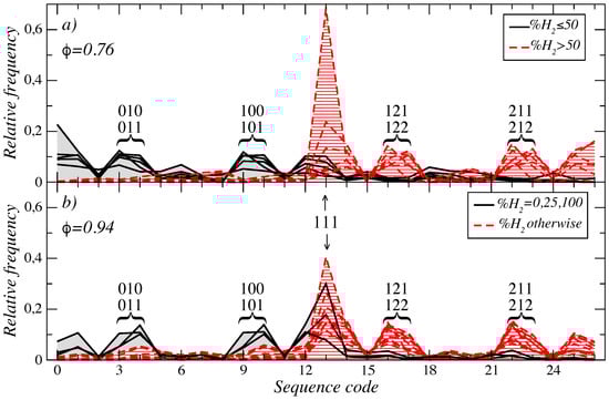 For a fuel mixture with fuel–air ratio close to stoichiometric conditions (, Figure 11b) the grouping in terms of is more subtle. Hydrogen concentrations that present similar histograms are shown in Figure 11b. Solid lines correspond to , 25, and 100. The comments above for and apply in this case. In the rest of cases (dashed lines), distribution of populations is similar to in Figure 11a. Hence, for a relatively high fuel–air ratio the evolution with hydrogen concentration is not as straightforward as for lean mixtures. An interesting difference between lean and stoichiometric mixtures is that in the latter the codes 0 and 26 (the extremes) are infrequent.