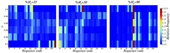 In Figure 13 the SSHs for different values of are plotted. Again, the absence of wild transitions is remarkable. Three specific hydrogen concentrations are depicted. In Figure 13a, with , no variability codes are as significant as soft transitions codes in most of the cases. Only in the case of is evidence of boomerang dynamics observed, indicating that for lean mixture of and low the dynamics are significantly unstable. Also, remarkable asymmetry is present mainly in Figure 13a,b. This is associated to a two-state intermittency, as was previously discussed for the noisy logistic map process. This asymmetry tends to disappear in Figure 13c, with indicating more regularity in the central region with uncorrelated variability, as discussed above for white noise behavior. Also, when is increased in Figure 13b,c, a central code 13 arises. This is indicative of reduction of variability when hydrogen concentration is increased. The case , resembles to a high extent the pattern of white noise (see Figure 9). Figure 14 gives a whole picture of the frequency distribution in terms of and .