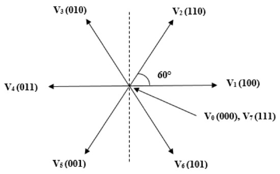 Direct Torque control (DTC) was proposed by I. Takahashi for controlling induction motors in the mid 1980s [6,7]. The main feature of DTC is to apply appropriate voltage space vectors for voltage source inverter (VSI) from a predefined switching table. Voltage vectors with their position in space is shown in Figure 1. The six voltage space-vectors divides the space domain into six equal-area sectors. Either or can be used to represent a null vector at the origin. As DTC does not rely on pulse-width-modulation for generating the inverter voltage vectors, it requires less computational time with a reduced structure.