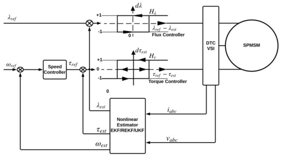 First, we revisit the traditional extended Kalman filter [28,29]. Over the past 40 years, EKF has been the most widely used nonlinear estimation technique for various industrial applications [30,31,32]. In order to provide a more reliable nonlinear estimation against external disturbances, noise, bad data and measurement failures, we propose the unscented Kalman filter (UKF) and the resilient extended Kalman filter (REKF)-based sensorless DTC technique for permanent magnet synchronous motors.