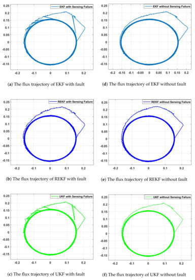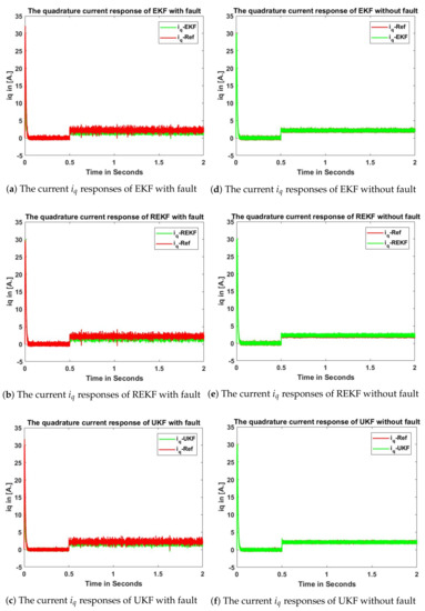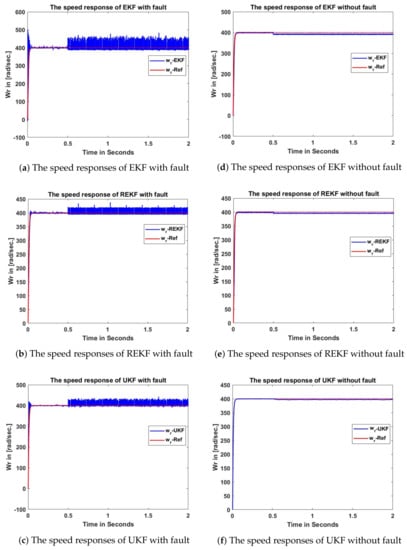 The final reference speed of SPMSM motor is set to be 400 mechanical rad/s. An external load of 1.5 Nm is applied at 0.5 s. Figure 5, Figure 6, Figure 7 and Figure 8 show rotor speed, developed torque, stator flux, quadrature-axis stator current estimation comparisons, respectively. Figures in the first, second and third row show EKF, REKF and UKF estimation results, respectively. The first column figures are nonlinear estimation results under sensing failure condition. The second column figures are nonlinear estimation results without sensing failures. Note that EKF, UKF and REKF all converge to the real-state values. However, since the EKF uses first-order linearization to update the covariance of the state, it shows more estimation error compared with REKF and UKF.