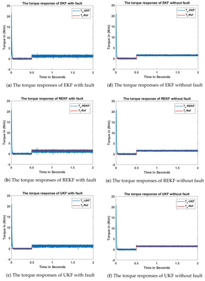 Without measurement failures, the estimation error comparisons of EKF, UKF and REKF are summarized in Table 3, Table 4 and Table 5. In comparison with EKF and REKF, UKF shows superior accuracy in torque, speed, and current estimation, under the condition that all sensors work properly. Under no sensing failure condition, UKF tracks the real state variables more closely with less ripples, since it relies on the unscented transformation to characterize the probability density function, without linearization involved. EKF truncates Taylor series of the mean at the first term, its prediction error of the mean value is in the second and higher order terms. EKF truncates at the first term of the covariance matrix, therefore, it is correct up to the second order with errors in fourth order term and above. UKF does not truncate any terms of the Taylor series, but uses sigma points through nonlinear transformation to decide the mean and covariance.