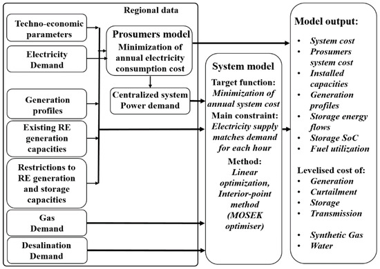The target function of the model is to optimize the system so that the total annual energy system cost is minimized. This cost is calculated as the addition of the annual costs of the installed capacities of each technology, electricity generation costs, and costs of generation ramping. In addition, the energy system takes account of the PV prosumers for residential, commercial and industrial sectors and their respective capacities of rooftop PV systems and batteries. The target function for prosumers is the minimization of the cost of consumed electricity. This cost is calculated as the sum of self-generation cost, annual cost, and cost of electricity consumed from the grid. A multi-node approach is utilised in the model, which allows for the definition of any preferred configuration. The main optimization constraint is to guarantee electricity coverage of local demand is considered on an hourly basis for the applied year, as shown in Equation (1). The model overview is shown in Figure 3.