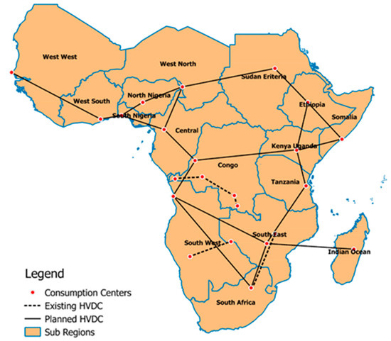 Sub-Saharan African sub-regions and HVDC transmission lines configuration.
