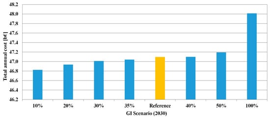 Figure 6 and Figure 7 show the total annual cost trend for the GI scenarios in 2030 and 2040, respectively. From Figure 6 it can be seen that if the cost overrun exceeds 35% (as such projects usually do at least), the cost to the system is too high compared to the reference without GI. Furthermore, Figure 7 shows that even if the cost remains as announced, the cost to the system is too high compared to the alternative without GI for 2040 assumptions. This clearly shows that with cost overrun up to around +40% and 0% for 2030 and 2040 scenarios, respectively, the project is economically beneficial (not taking into account the environmental impact). Above that limit the economic benefit disappears and turns into a burden.