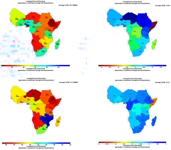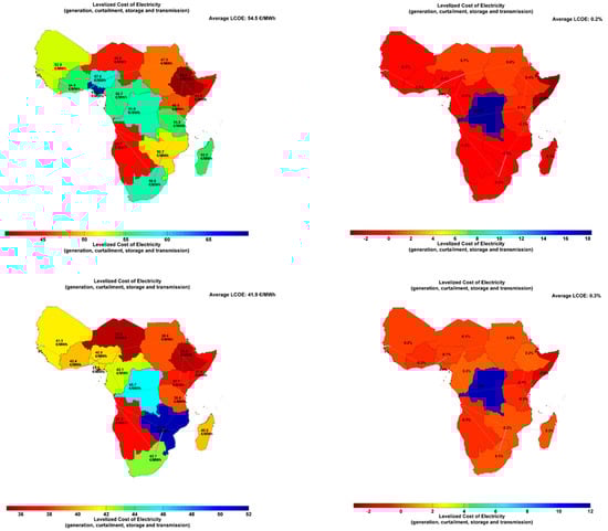 Similarly, Figure 9 (top right) and (bottom right) shows the percentage difference in LCOE for the Inga 3 expected scenario for the years 2030 and 2040, respectively. Regarding LCOE, the regional impact of Inga 3 in these two scenarios is as well negligible, the relative percentage difference in LCOE was in the range of −3.5% to 18.4% in 2030 and from −0.7% to 11.5% in 2040. However, most of the cost burden is allocated to the DRC as LCOE increases by 18.4% and 11.5% in 2030 and 2040, respectively. The overall regional average increased by 0.2% and 0.3% in 2030 and 2040, respectively, in comparison to the Inga 3 announced cost scenario. The overall average LCOE is 54.5 €/MWh in 2030 and 41.9 €/MWh in 2040 as shown in Figure 9 (top left) and (bottom left). In this scenario, DRC experience tremendous increase in LCOE, yet the benefit impact is negligible in the whole region, again with Somalia being the country with the largest benefit, though almost negligible, of −3.5% and −2% LCOE in 2030 and 2040 scenarios, respectively.