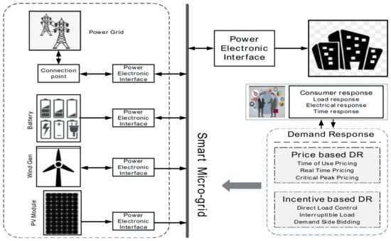Microgrid is a small regional power generation, which contains clean energy power, electric energy storage device, electronic device, load and automatic demand response system []. Microgrid system can realize self-control, protection and management, and it can run not only in the grid-connected operation grid, but also under the stand-alone operation. Microgrid is a concept of the traditional large power grid, which is a network composed of multiple distributed power sources and loads, and it is connected to the conventional power grid through static switches. With the development of intelligent power technology, the development of a microgrid can promote the large-scale access of DG and renewable energy, and realize high-reliability supply of various energy forms of load. In addition, it is an effective means to realize the popularization of smart grid, and lead the transition from traditional power grid to smart grid.
