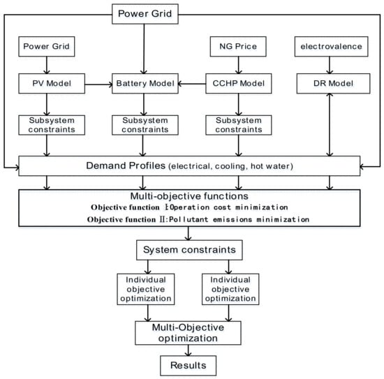 The power sources for the load are DG, grid power supply and energy storage. In order to achieve the purpose of cost savings, DG is taken as the first priority of power supply energy, followed by energy storage batteries, and the last is the power grid power supply. Based on the above three types of microgrid resources, this paper considers the demand response mechanism to coordinate and optimize the distributed, energy storage and response load. A flow chart of the proposed microgrid optimization model is shown in Figure 2.