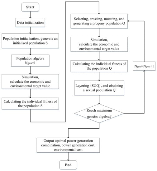 Considering the output of distributed generation and load level, the constraint value for each variable is set. Based on the scheduling strategy of demand response mechanism, the model presented is solved by Non-domimated Sorting Genetic Algorithm II (NSGA-II). In order to verify the performance of NSGA-II, this paper applied it to different scenarios of microgrid scheduling. The population size (NP) is set to 500, and the value of the maximum variation generations is 100, and the constraint processing method Ref. []. The flow chart of the NSGA-II proposed is shown in Figure 3.