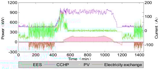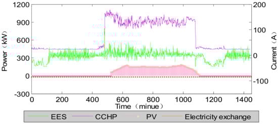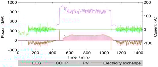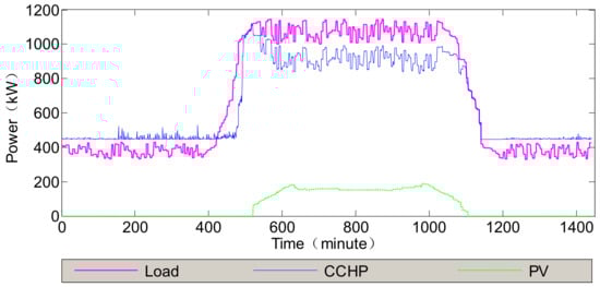 In order to verify the accuracy of the optimization model established in this paper, a typical microgrid including CCHP, PV and EES system is optimized and analyzed in this study. Typical load data for 1440 min of the day is selected for analysis, and the power predicted of CCHP, PV, and loads is shown in the Figure 4. In this microgrid, the capacity of CCHP is 1.5 MW, PV is 400 kW, electric load is 667 kW. And the EES capacity is 300 kWh, charge and discharge efficiency of battery is 90%, the actual cumulative throughput is . The TOU price is shown in the Table 1.