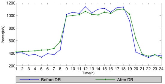 According to the demand response model, the load characteristics before and after demand response are obtained (shown in Table 3), and the system load curve is also obtained (shown in Figure 4). Peak valley difference of the system decrease after the demand response is shown in Figure 5.