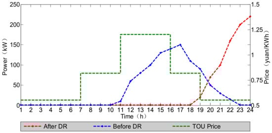 In Figure 6, the charging time of the electric vehicle is mainly concentrated at 10:00 to 18:00 and 20:00 to 24:00. According to TOU price, users are willing to charge in the low night electricity price period, which can not only meet the needs of vehicles, but also save charging costs [].