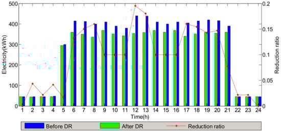 In Figure 7, the load of lighting system is not adjusted before 6:00 and after 21:00 due to the user’s habits. Between 6:00 and 21:00, the load reduction of the lighting system reached more than 30%. In addition, the maximum load reduction ratio can reach 10~20% after the implementation of the demand response program during the peak power consumption period.