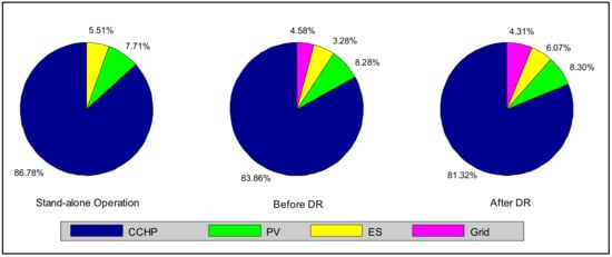 According to Table 4 and optimization results, when the system operates in off-grid, the output of PV system can’t meet the requirements of the system, and the CCHP and the EES are required to supply power to the system, so that the operation cost is high. When the system operates in grid-connected, the system sells excess power in response to changes in electricity prices and to obtain economic benefits, so that the operation cost is lower than that in the off-grid operation. After the DR program, the power from the grid has little change, but the power delivered to grid increases obviously. The amount of electricity sold per day is up to 583.051~803.302 kWh. In the microgrid with PV, ES and CCHP, the operation cost mainly comes from the operation and maintenance cost and fuel cost of the system. The composition of the system cost in different scenarios is shown in Figure 12.