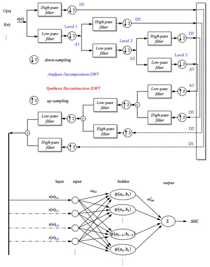 Structure of a three-level, DWT-based decomposition and reconstruction processes and DWT-WNN-based SOC estimation process.