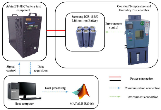 Figure 3 shows the test bench, which includes Arbin BT-5HC (Arbin, College Station, TX, USA) battery test equipment, a constant temperature and humidity chamber, tested Samsung ICR-18650-22P lithium-ion batteries (Samsung, Seoul, South Korea), and a host computer with MATLAB (R2016b, MathWorks, Natick, MA, USA) installed. The test chamber (Sanwood, Dongguan, China) controls the temperature and humidity environment of tested batteries. The battery test equipment has a voltage range of 5 V, four current ranges of 0.02 A, 0.5 A, 5 A, and 30 A, and measurement accuracy of current and voltage of full scale range. The battery test equipment controls the charge and discharge process and transmits the experimental data to the host computer in which the MATLAB is used to conduct the estimation process and analyze the experiment results. The tested batteries have a nominal capacity of 2150 mA, maximum continuous discharging current of 10 A, a nominal voltage of 3.7 V, charging end voltage of 4.2 V, and discharging cut-off voltage of 2.75 V. The set ambient temperature is fixed at 25 °C.