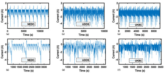 Current profiles and zoom figure of (a,b) NEDC, (c,d) UDDS, and (e,f) UKBC.