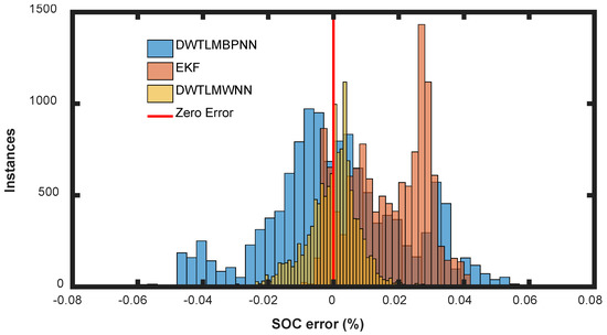 According to Figure 5b–d, the application of L-M algorithm and DWT method makes effective improvement on the SOC estimation accuracy. Based on the exact values in Table 1, it is found that L-M algorithm reduces the mean absolute error considerably and greatly improves the approximation ability according to the values of the correlation coefficient R but cannot reduce the maximum error to a desired level. DWT method can well reduce the maximum error of SOC estimation. Compared with model-based EKF estimation methods and BPNN-based estimation methods, WNN-based methods have the characteristics of low mean absolute error (e.g., only the mean absolute errors of LMWNN and DWTLMWNN below 1.00%), and the proposed method can solve the high maximum error problem (e.g., the maximum error is reduced more than 5% compared with LMWNN method). Furthermore, according to the results that DWT method reduces the mean absolute error and maximum error of LMBPNN by 0.03% and 1.74%, respectively, but of LMWNN by 0.23% and 5.23%, respectively, it is found that the estimation accuracy improvement using the combination of DWT method and adaptive WNN method is more considerable, which indicates the superiority of the proposed combination method. Figure 6 shows the error histogram of EKF, DWTLMBPNN, and DWTLMWNN, which directly supports that the DWTLMWNN SOC estimation method has advantage of estimation accuracy. Although the training time of ANN-based method is larger than the EKF based method unavoidably according to Table 1, the estimation time of ANN-based method is satisfying, which means the feasibility of actual SOC estimation application.