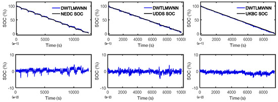 In this section, the DWTLMWNN is trained by the data collected under the NEDC and UDDS, and then validated under the UKBC. As shown in Figure 8 and in Table 4, for the trained driving cycles and the untrained driving cycle, the DWTLMWNN SOC estimation method has good estimation performance in terms of the low mean absolute errors and maximum errors. Although the results show that the accuracy of SOC estimation under the NEDC reduces, the overall estimation results are ensured to a satisfying level. Compared with the EKF method, the DWTLMWNN SOC estimation method has a more reliable performance for the unexpected conditions.