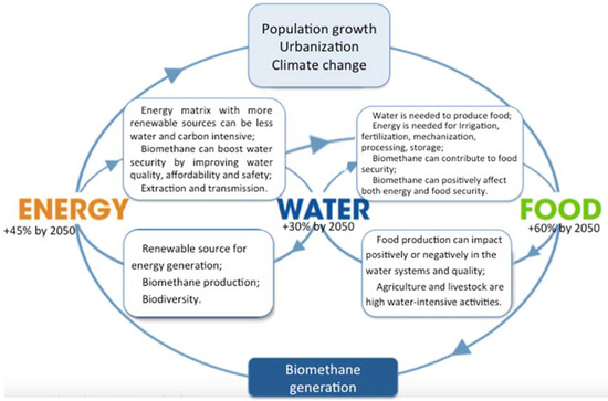 For the present Special Issue of Energies, it is especially important to establish the nexus dimensions of biomethane. Assuring water, energy and food security in a sustainable and equitable manner is a central challenge faced by planners, decision-makers, and resource users globally. UN Water [15] notes that, based on global demand trends, food production will increase 60% by 2050, requiring 45% more energy and 30% more water.