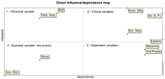 With the information consistently compiled, it was possible to analyze the most significant variables that determined farmers’ participation in the biogas condominium. MICMAC (Impact Matrix Cross-Reference Multiplication Applied to a Classification) software was selected to eliminate possible calculation errors and give more support and credibility to the analysis [13].