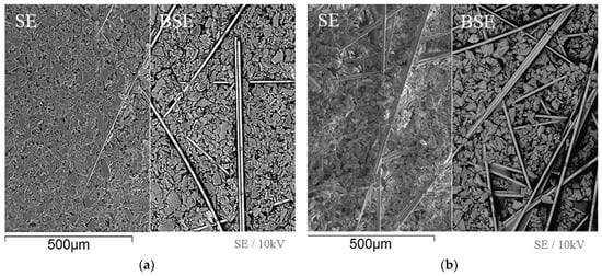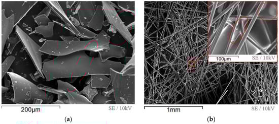 The glass platelets showed a flat surface and in the case of ground glass platelets, an average particle size below 32 µm (d50 = 23.1 µm) and a thickness that was determined to an average value below 5 µm. The resulting aspect ratio was 1:6 to 1:10. In this study, the glass platelets were ground in a jet mill. The glass fiber nonwoven showed strait glass fibers with an average length of 12 mm and diameter of 10 µm. The scanning electron microscopy (SEM) images show residues of the binder, a modified polycarboxylic acid (detailed view in Figure 1b). According to the nonwoven manufacturer’s data sheet, the thickness of the glass fiber nonwoven was 300 µm. The measured thickness of 188 µm was less than the stated value due to interlacing of the fibers during measuring.
