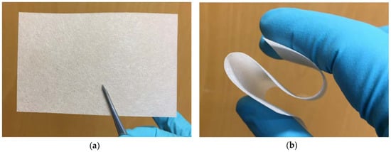 Pictures of a glass fiber nonwoven/glass platelet composite separator, (a) top view; (b) demonstration of the separators flexibility.