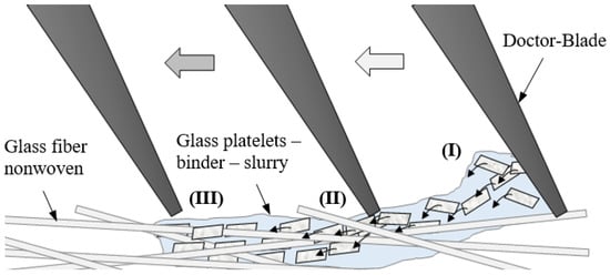 Moreover, the sedimentation of the platelets inside the slurry during tape casting plays an important role. For this reason, the viscosity of the slurry is crucial for good platelet integration. If the slurry is too viscous, sedimentation of the platelets inside the binder matrix is hindered, whereas in a low-viscous slurry, the nonwoven is filled with a smaller amount of platelets. Certain values for the viscosity cannot be provided due to the dependency on the various process parameters mentioned above that must always be adapted to the specific properties of the glass fiber nonwoven used. In the case of glass platelets with average dimensions smaller than 32 µm in combination with a premixed sodium alginate binder (ratio water:binder 9:1), with the used glass fiber nonwoven and a feed rate of the doctor-blade of 2.5 mm/s, the viscosity should be between 102 Pa s and 104 Pa s.