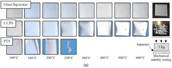 The shrinkage of various separators was observed in a so-called hot oven test at temperatures from 100 to 600 °C in steps of 100 °C and extra steps at 166 °C and 250 °C, indicating the melting points of the used PP and PET of the polymer-based separators PTS and CCPS. The results are shown in Figure 5a. To calculate the particular shrinkage, the average change of the samples’ edge lengths was used according to Equation (2).