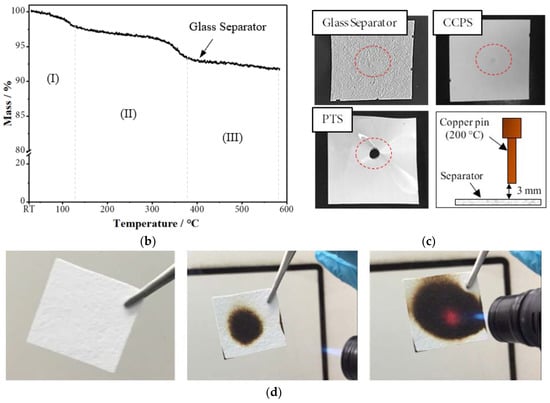 Thermal stability of a glass fiber nonwoven/glass platelet composite separator, (a) temperature-dependent shrinkage (hot-oven test) compared to polymer-based separators; (b) thermogravimetric analysis; (c) behavior at exposures to 200 °C by heat radiation (hot-punch test); (d) demonstration of the flame retardation of the glass composite separator.