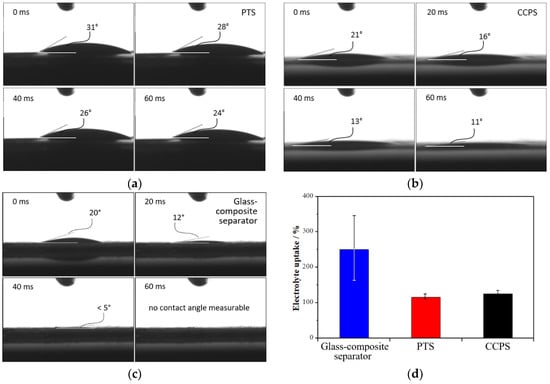 Photographs of the contact angle measured with 10 µL DMC (a) polymer trilayer separator (PTS); (b) ceramic-coated polymer separator (CCPS); (c) glass composite separator; (d) electrolyte uptake of glass composite separator compared to PTS and CCPS.