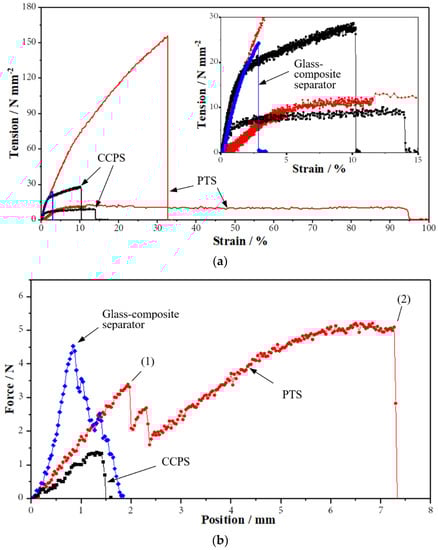 Samples of the here-investigated glass composite separator, as well as the polymer-based separators, were fixed and stretched in a tensile testing machine. Figure 7a depicts the results.