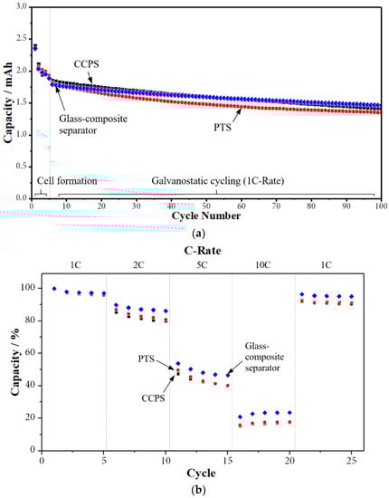 The glass composite separator, as well as the PTS and the CCPS, was charged/discharged in a full-cell configuration setup. Therefore, graphite served as the anode and LFP as the cathode. After cell preparation, five cycles with different current rates (C-rate) were performed for a defined formation of the cell. After cell formation, a constant current rate of 1 C at a DoD (depth of discharge) of 100% impinged 95 consecutive cycles. Figure 8a shows the capacity retention of the prepared glass-based separator compared to PTS and CCPS. In addition, the rate capability at current rates of 1 C, 2 C, 5 C, and 10 C was measured (Figure 8b) after the capacity retention test with a constant C-rate as shown in Figure 8a. The test cells were all equipped with the same amount of active material leading to a starting cell capacity of 2.38 mAh (±0.01 mAh).