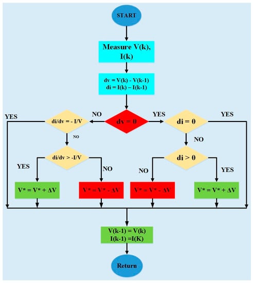 The MPPT unit will make sure that maximum power is rendered to the grid for the given atmospheric conditions. Many algorithms have been administered so far in the research forum and this work adopted incremental conductance (INC) method of MPPT. The INC method is superior to its close competitor perturb and observe (P&O) in terms of reliable, oscillation free power output. The flow diagram of INC MPPT is given in Figure 4.